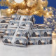 Rustic wooden barn in winter with frosty trees and snowflakes.