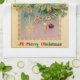 Old world red-robed and hooded Father Christmas with tree decorated with Victorian ornaments and goodies in gold border and Merry Christmas text.
