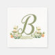 This napkin features an olive green, cursive, monogram initial. The bottom of the monogram has a floral arrangement and a green ribbon banner that you can personalise with a name.