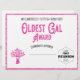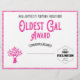 Have some fun and hand out this Oldest Gal Award at your family reunion awards ceremony. Pink, black and white with distressed look includes a family tree with a heart and a family reunion logo. Write in the award winners name, add your family name, year of event and location of the event. Nice family reunion keepsake memento.