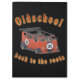 The design features a retro-style red old school van with the number "35" on the front and sides. The bus has a distinctive tuning design with a cut-off roof and a large rear spoiler, giving it a racing and hot rod look. Above it is written "Oldschool" in eye-catching vintage font, while underneath the sentence "back to the roots" underlines the nostalgic character of the design. The color palette includes warm retro tones such as red, beige, orange and black.