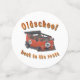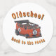 The design features a retro-style red old school van with the number "35" on the front and sides. The bus has a distinctive tuning design with a cut-off roof and a large rear spoiler, giving it a racing and hot rod look. Above it is written "Oldschool" in eye-catching vintage font, while underneath the sentence "back to the roots" underlines the nostalgic character of the design. The colour palette includes warm retro tones such as red, beige, orange and black.