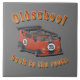 The design features a retro-style red old school van with the number "35" on the front and sides. The bus has a distinctive tuning design with a cut-off roof and a large rear spoiler, giving it a racing and hot rod look. Above it is written "Oldschool" in eye-catching vintage font, while underneath the sentence "back to the roots" underlines the nostalgic character of the design. The colour palette includes warm retro tones such as red, beige, orange and black.
