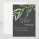 This moody olive branch engagement party invitation features a dark background, botanical vintage inspired olive branch invitation, and expressive lettering.