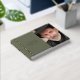 In Loving Memory, Funeral / Celebration of Life photo guestbook, with a simple, minimal, and elegant design with a soft velvety hardcover in an attractive olive green tone, and real foil in stripes, and text details. Ability to change "In loving memory" to "Celebrating the Life of" by using the template text box. Choose from three size options and three foil colours: gold, silver, or rose gold. Personalise it with your loved one information on the front and spine and add on the back any message you like.
