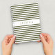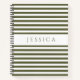 Spiral notebook featuring a personalised name print on a minimalist olive green and white striped pattern.