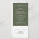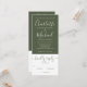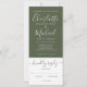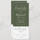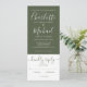 An all in one wedding invitation featuring modern signature script names and elegant typography on an olive green background. The invitation includes an RSVP card that can be cut off and guest information details. Designed by Thisisnotme©