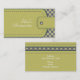 Olive green leather look and pattern business card template featuring two olive green bands with seams and a button in leather style-not real leather just a PRINTED image and geometric pattern in grey and olive green. This modern yet with a retro flair business card template is fully customisable.