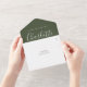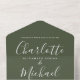All in one wedding invitation featuring elegant signature script name and monogram initials on an olive green background. The invitation includes a perforated RSVP card with your wedding website QR code and details. Designed by Thisisnotme©