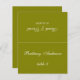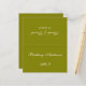A simple olive green wedding place card with the guest name and the table number printed on its front and the bride and groom names and the wedding date printed on the other side (that is the other half, before folding it). All text is white.