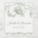 Elevate your wedding table with this elegant Toile de Jouy wedding bottle label in a soft olive green palette. Inspired by classic French engravings, the design features an ornate floral frame and a charming vintage flower basket illustration, creating a refined and timeless look.