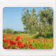 Mousepad with an old olive tree in a poppy field full of vibrant red poppies in a landscape in Tuscany, Italy.