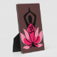 A vibrant OM namaste spiritual lotus flower yoga pose silhouette design on an umber background colour.