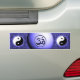 Bumper sticker with a 3D effect and bluish tint with two Yin Yang symbols, representing universal balance, and Om representing creation.