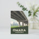 A stylised illustration of the Omaha, Nebraska skyline viewed from beneath a large concrete overpass with a grassy field in the foreground.