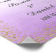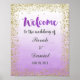 Poster print for welcome wedding sign with faux gold glitter design and ombre purple watercolor background.