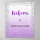 Poster print for welcome sign with faux silver glitter design and ombre purple watercolor background.