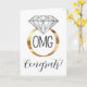 This greeting card says OMG Congrats! on the front along with a gold banded white diamond engagement ring graphic and a heartfelt, customisable message on the inside.