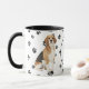 An adorable Beagle dog looks out at you from two sides of this mug. The text between the two images says "On the 8th day, God created the BEAGLE and called it VERY GOOD". The dog images and the white oval banner containing the text fields are placed on a white background with black paw prints. Cute!