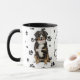 A beautiful Bernese Mountain Dog looks out at you from two sides of this mug. The text between the two images says "On the 8th day, God created the Bernese Mountain Dog and called it VERY GOOD". The dog images and the white oval banner containing the text fields are placed on a white background with black paw prints.