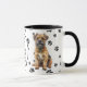 An adorable Border Terrier Dog sits on two sides of this mug. The text between the two images says "On the 8th day, God created the BORDER TERRIER and called it VERY GOOD". The dog images and the white oval banner containing the text fields are placed on a white background with black paw prints.