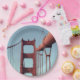 Looking up as I walked across the Golden Gate Bridge one sunny afternoon in San Francisco, California, one of its massive suspension cables loomed overhead. It stretches out of the upper right corner of the photograph to the top of an red-orange tower near the centre. The suspension cable on the left seems skinny in comparison as it meets the centre of the left edge of frame, the bridge's symmetry made askew by the perspective. Pairs of suspender ropes hang from the main cables, the ones on the left side of the bridge giving the clear blue sky a pinstripe effect in the lower left corner of the photo. Without the road in view, the geometry of the International Orange painted bridge is accentuated against the blue sky.