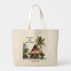 Featuring a charming depiction of a thatched brown-roofed tiki hut beach house on stilts, nestled on a sandy beach, this beach bag transports you to a tropical paradise. With a palm tree adorning the right side and lush tropical foliage on the left, the scene exudes tranquillity and serenity.