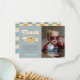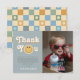 This groovy boys 1st birthday thank you card captures retro 70s vibes with a cute blue smile theme, and a pastel blue chequered pattern on the back. Fully customisable, it includes space for your message, a photo and name. Perfect for a "One Cool Dude" boho birthday.