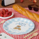 Add a sweet touch to your little one's first birthday with this blue gingham paper plate, perfect for a golden retriever themed celebration. Featuring the phrase "One Golden Year" and a hand drawn golden retriever, this design can be personalized with your child’s name and party date. It’s a fun and easy way to tie your blue puppy party theme together for snacks, cake, and more.