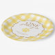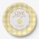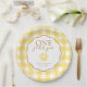 Celebrate her One Golden Year in sweet puppy style with this round paper plate. A yellow gingham border surrounds a scalloped centre that features a gingham paw print and editable text for your girl's name and first birthday date. Perfect for cake slices, snacks, and photo ready table settings at any golden retriever themed party.