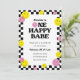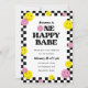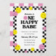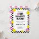A fun and bright 1st birthday party invitation for girls with yellow and pink smiling face icons, and black chequered border. "One happy babe" is in a groovy, retro font. If you would like to change this text, please contact me and I will make updates at no extra cost. The back of the card features a pink and white chequered pattern that suits the retro vibe. All of the colours are editable!