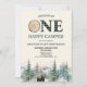 This is a Green ONE Happy Camper Woodland Forest Bear 1st Birthday Party Invitation.