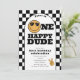 A cute happy birthday invitation design. A cute "One happy dude" happy themed first birthday party invitation. A happy dude themed birthday invitation that can be customized to your details.