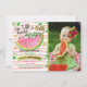 Is your little sweetie turning one? Then this invitation is for you! Features a photo of your child, a juicy watermelon slice with a bite with vines and seeds. Faux gold foil accents. Great for the little girl turning one.
