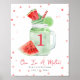 "one in a melon" themed 1st birthday featuring illustration of a watermelon lime smoothie in mason jar surrounded by confetti.