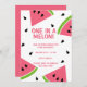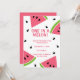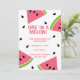 One in a Melon birthday party invitation, although text can be changed for any year birthday or baby shower. Summery and bright pink and green watermelon image with watermelon seed embellishments.