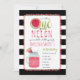Watermelon first birthday theme featuring "one in a melon" text phrase with watermelon slice incorporated into design. Border is pom pom inspired. Background is black and white stripe. Mason jar watermelon drink at bottom.