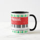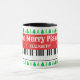 Grand piano keys Christmas mug for a piano player, pianist, student, teacher, musician, instructor, kids, friends, etc. Black and white piano keys and snowflakes on red stripes, Christmas tree at the top and bottom, with elegant script typography "One Merry Pianist!". Elegant personalised winter Holiday gift idea for him or her.
