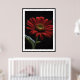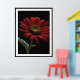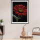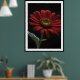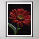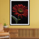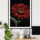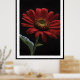 Pictured On A Black Background Is One Single Red Daisy Facing Left Side.