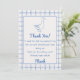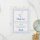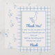 As you see this 1st birthday thank you card features the boy one silly goose blue theme. With hand drawn goose and gingham checkboards and ribbon bow with hand written script of thank you and thank you paragraph template. All of this design template is easily customisable by clicking on the personalisation button.