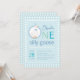 The background is light blue and white gingham chequered plaid pattern. The text is inside a light blue rectangle with round corners and white border. The word ONE has each letter in a different shade, and a white goose with a blue party hat inside the big O. The name is written in a blue script. In the lower part, i there is the info, with the date / time as a the left column, with the day big; they are separated by white lines.