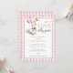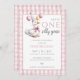 This charming first birthday party invitation features a cute little goose holding balloons and a pink gingham background. Designed by Thisisnotme©