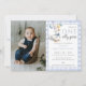 This charming first birthday party photo invitation features a cute little goose holding balloons and a blue gingham background. Designed by Thisisnotme©