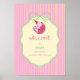 A charming pastel birthday design featuring a sleepy pink cat in a tiny party hat, framed inside a soft cream label with mint green bow details. The pink-and-yellow striped background adds a cheerful retro touch.