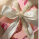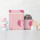 A charming pastel birthday design featuring a sleepy pink cat in a tiny party hat, framed inside a soft cream label with mint green bow details. The pink-and-yellow striped background adds a cheerful retro touch.