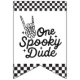 Halloween themed birthday "One Spooky Dude" featuring a cool ghost on skating board and knuckle sign. Perfect for a spooky yet cute Halloween themed kids birthday party.