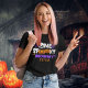 Fun design for Halloween families, with purple and orange colors and the "Frase ONE SPOOKY MOMMY" with a personalized breast name and images of pumpkins and murcielagos and halloween skeletons. This design is ideal for Halloween family parties or just to look great at Halloween parties. Don't think about it and get yours now