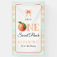 One sweet peach First Birthday watercolor stripes vertical banner. This delightful First Birthday sticker features the text "ONE sweet peach" which cleverly incorporates a peach graphic in place of the letter "O" and a coquette bow in peach. The text is placed in a white frame bordered with watercolor stripes in peach and mint green.