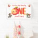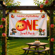 Decorate your celebration space with this whimsical first birthday party banner. The design features a delightful storybook scene with a kawaii peach character, a garden gnome, and a harvest girl in a sun-drenched orchard. Hang this vibrant backdrop behind the dessert table or high chair to create a perfect photo opportunity for your child's big milestone.