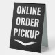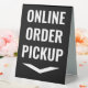 This is a black "Online Order Pickup" table tent sign with a down arrow. It is used to indicate where customers can pick up their online orders. Clear message and easy to spot.